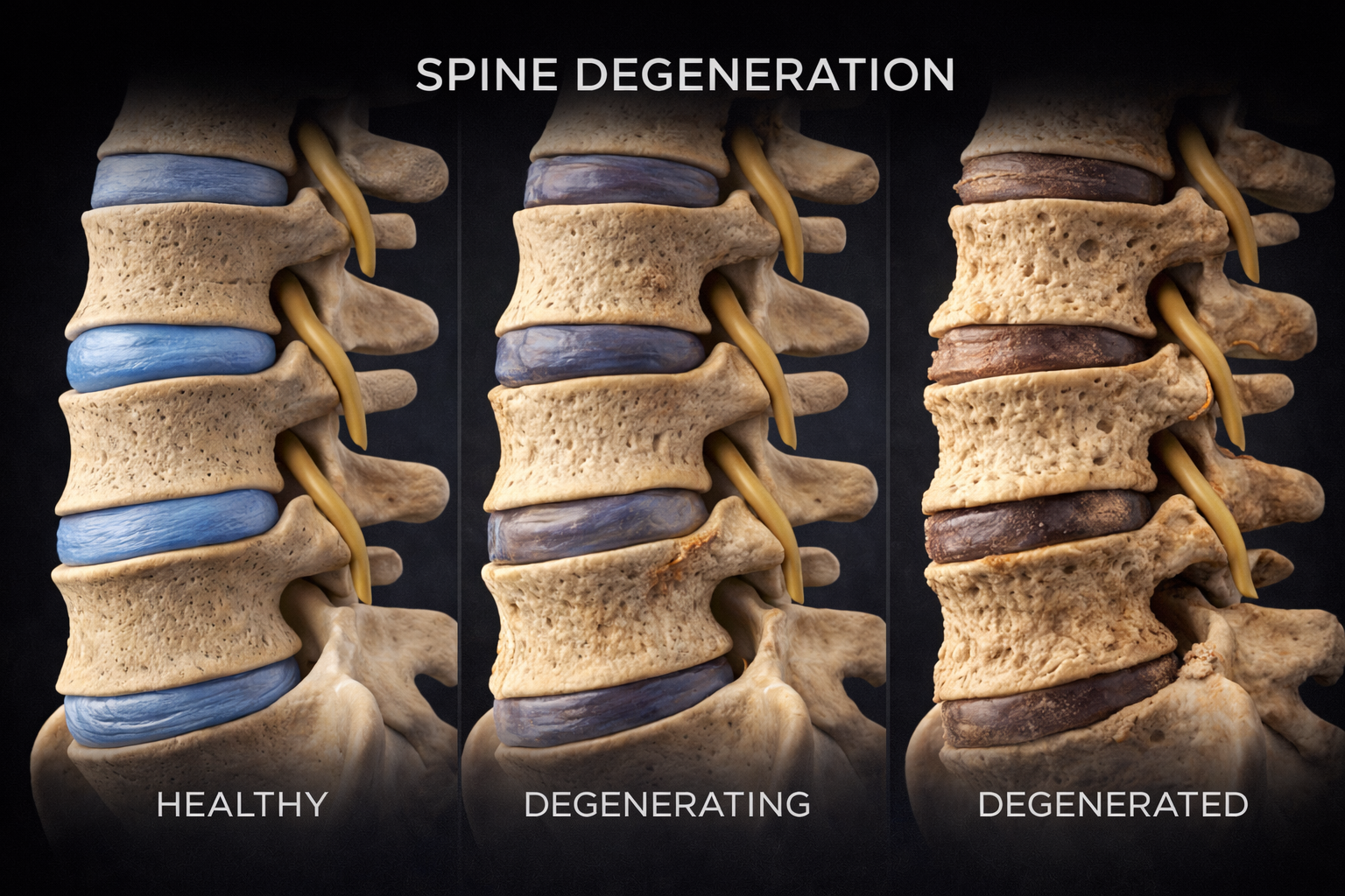 Spinal degeneration, often referred to as osteoarthritis of the spine, describes gradual, age-related changes in the discs and joints that allow the spine to move. Over time, intervertebral discs can lose hydration and height, and the small joints of the spine (facet joints) may develop arthritic changes. These processes are common and part of normal aging, though they don’t always cause pain.